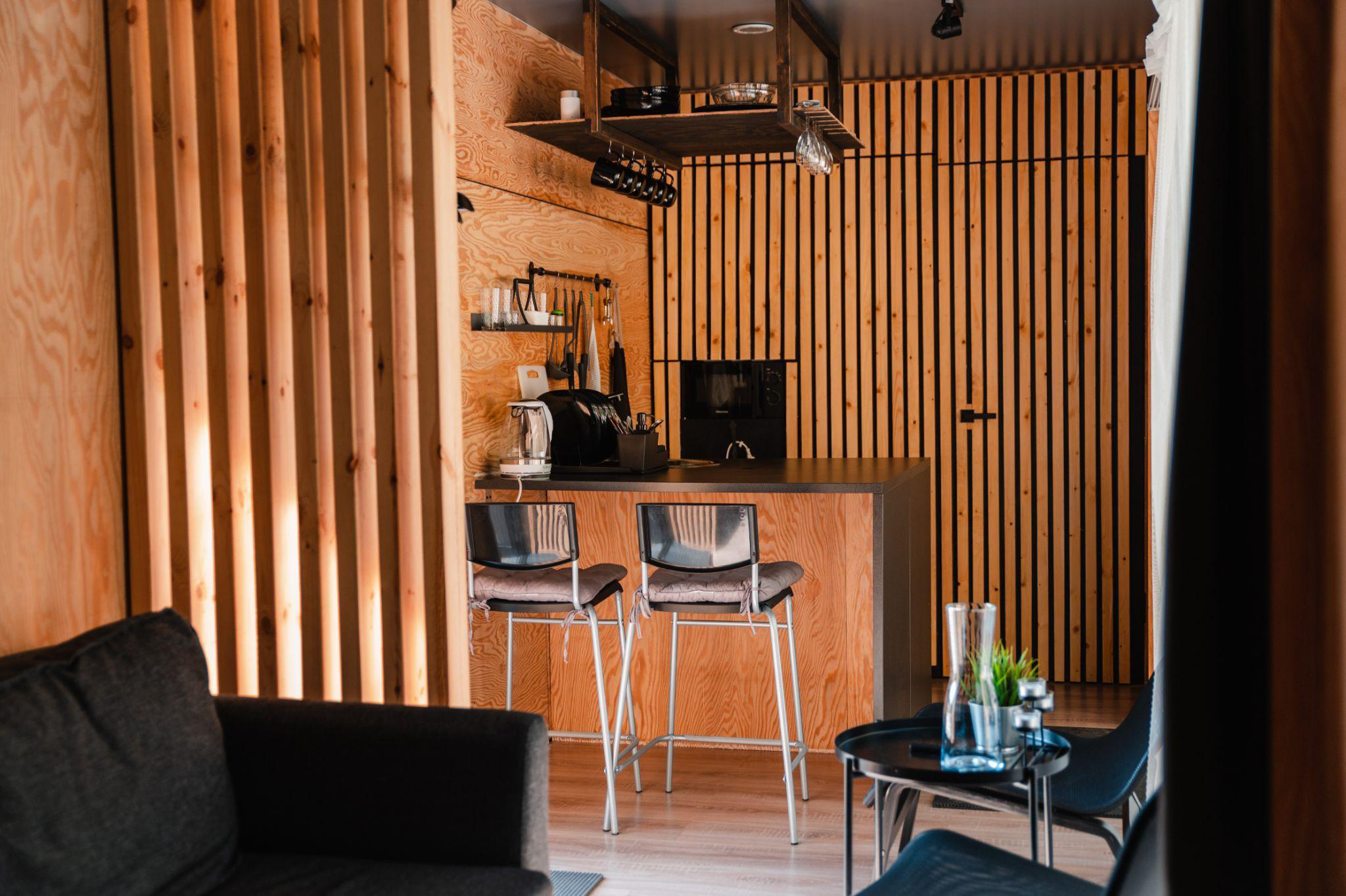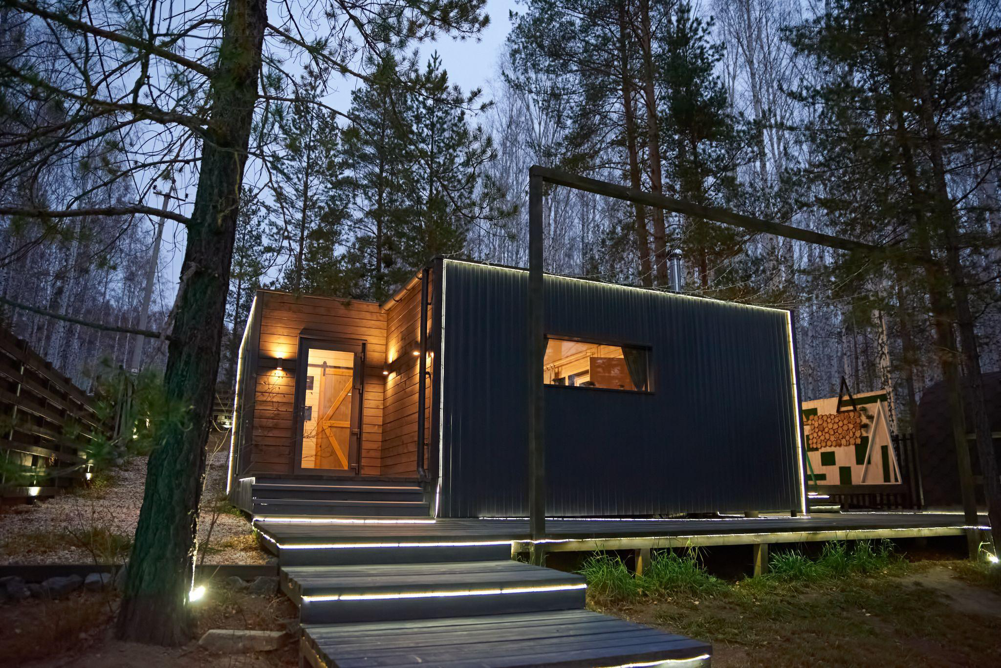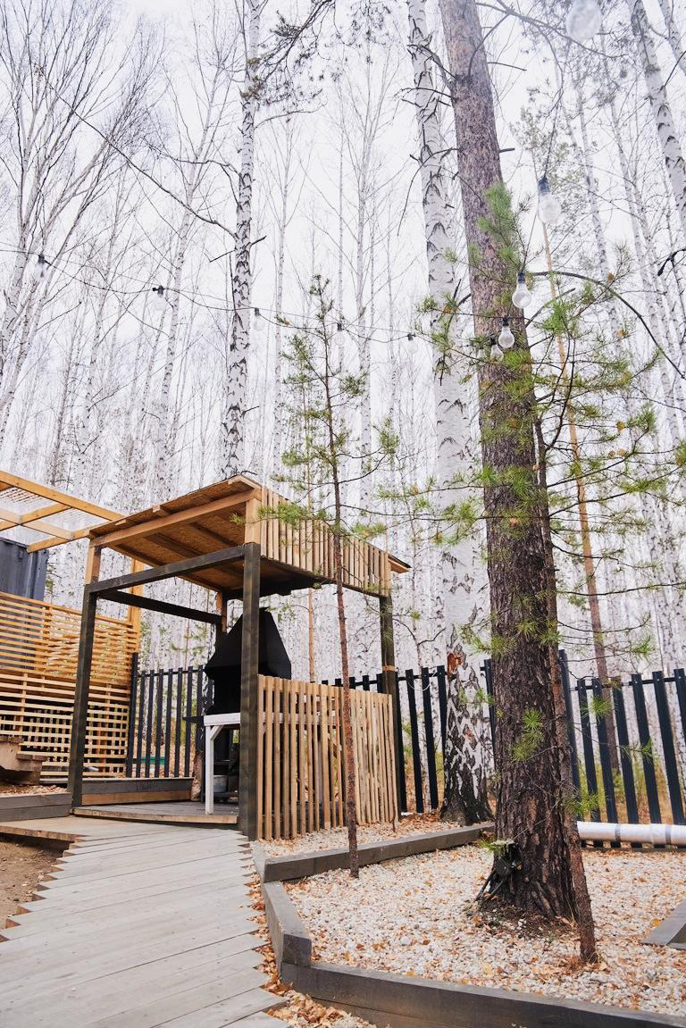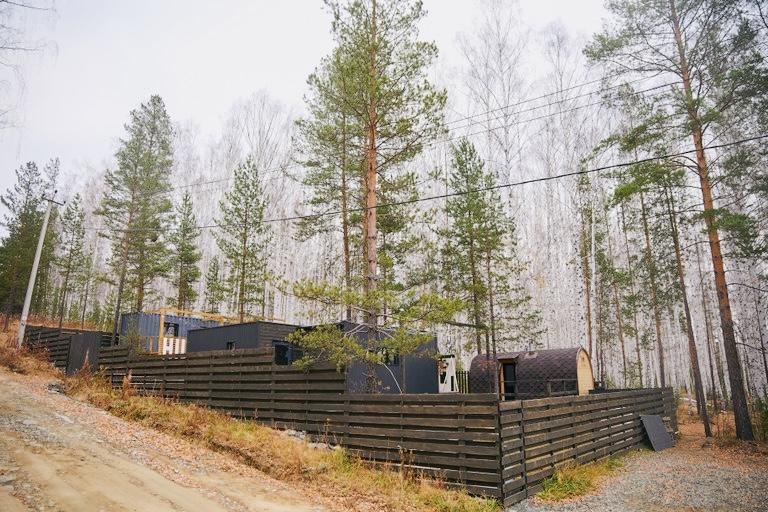 - Дом из морского контейнера площадью 23 м2 расположен в самой высокой точке комплекса. Через панорамные окна открывается вид на сцену и всю территорию комплекса.