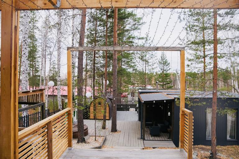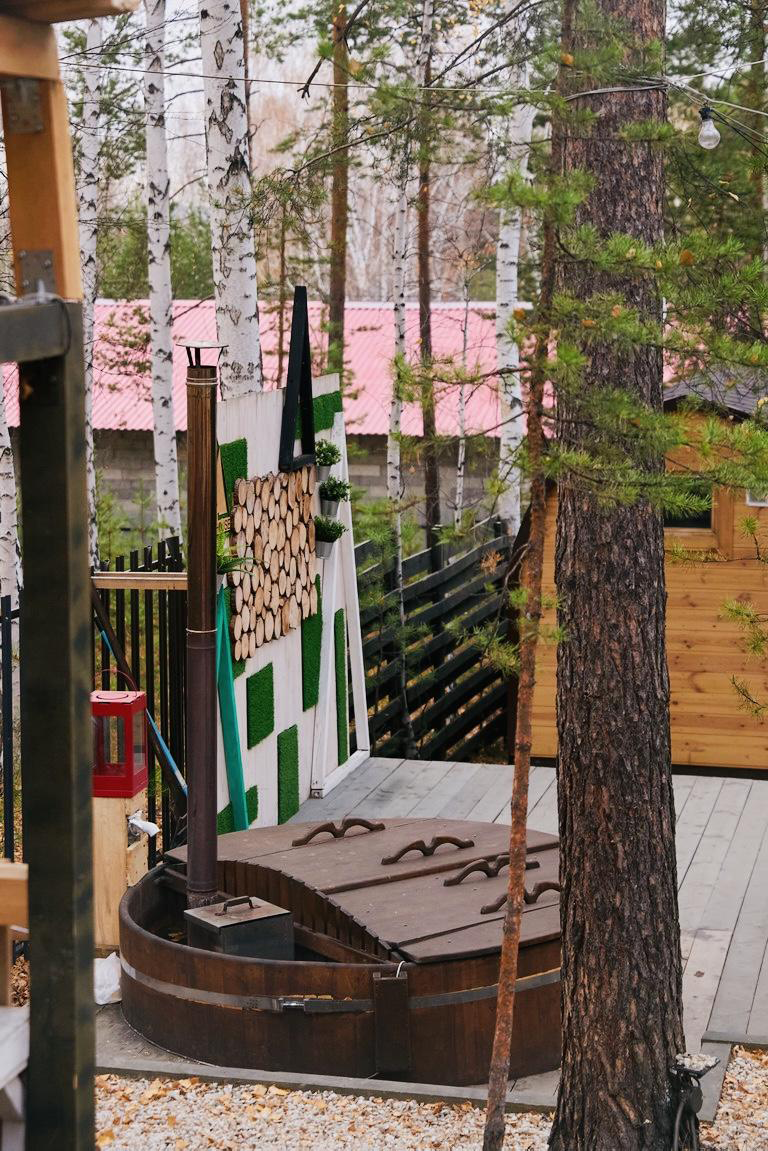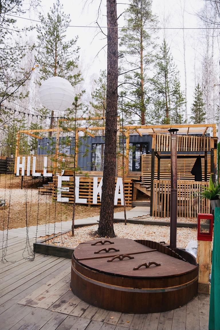 Комплекс домов ELKA HILLS расположен на склоне холма и граничит со смешанным лесом. При монтаже домов были сохранены все деревья, на территории растут сосны, березы и ели. Баня на дровах вмещает до 6-8 человек, в печи-призме использован камень Малиновый кварцит.