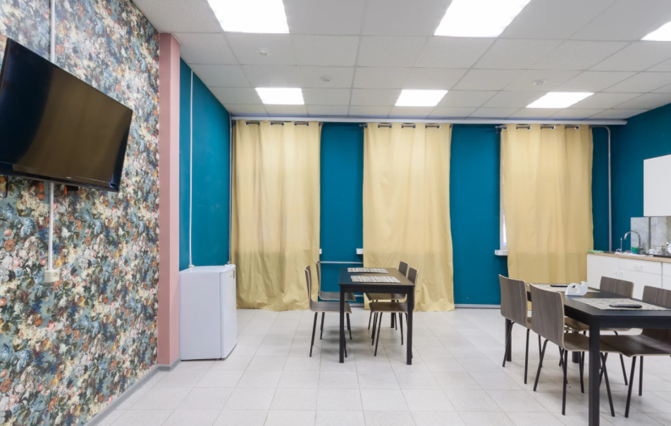 Общий телевизор. В холле хостела организовано специальное место для отдыха с удобным диваном и большим жидкокристаллическим телевизором.